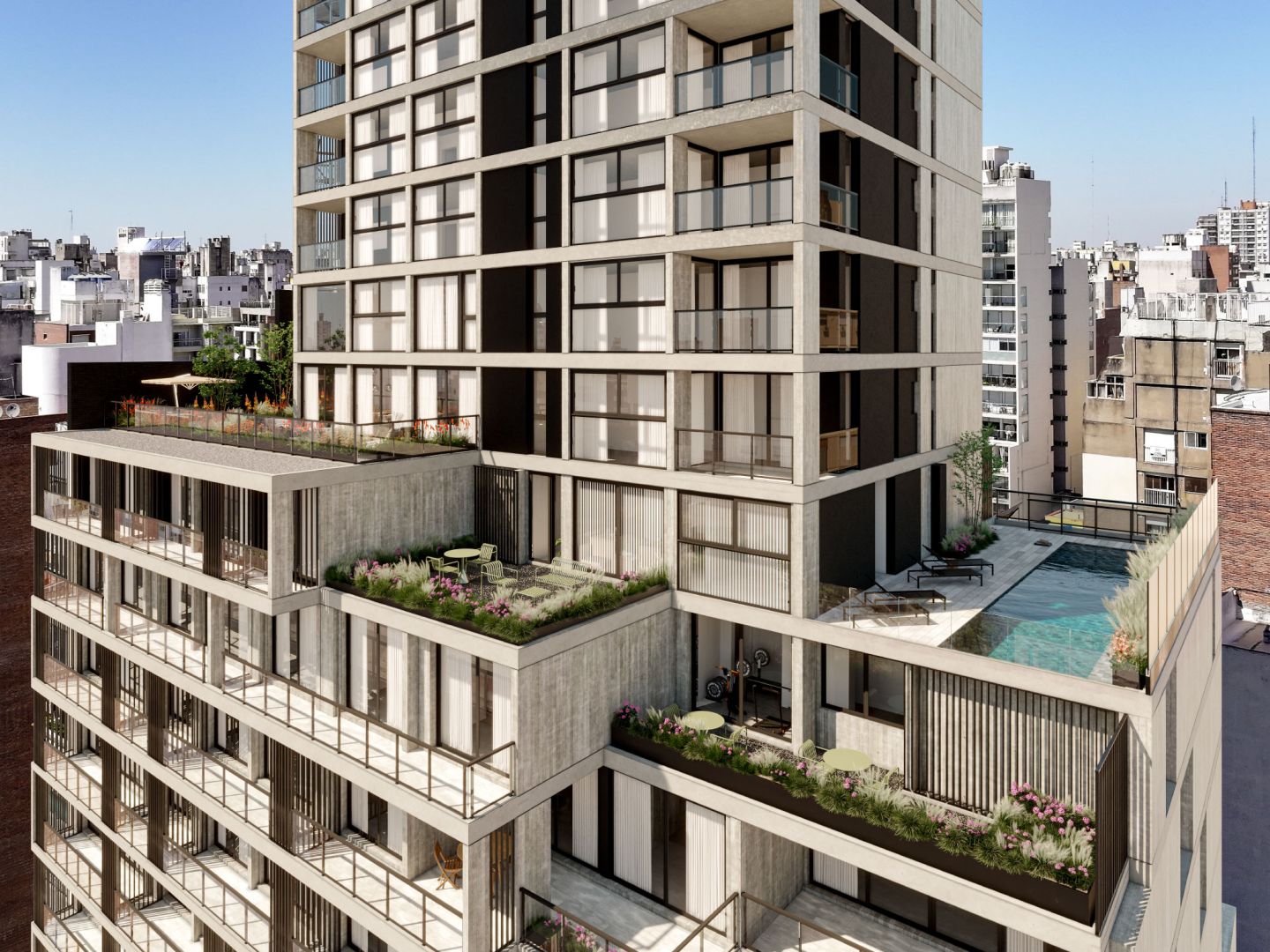 desplazan generando terrazas y dobles alturas, culminando con un rooftop con vista inédita e inesperada de la ciudad.